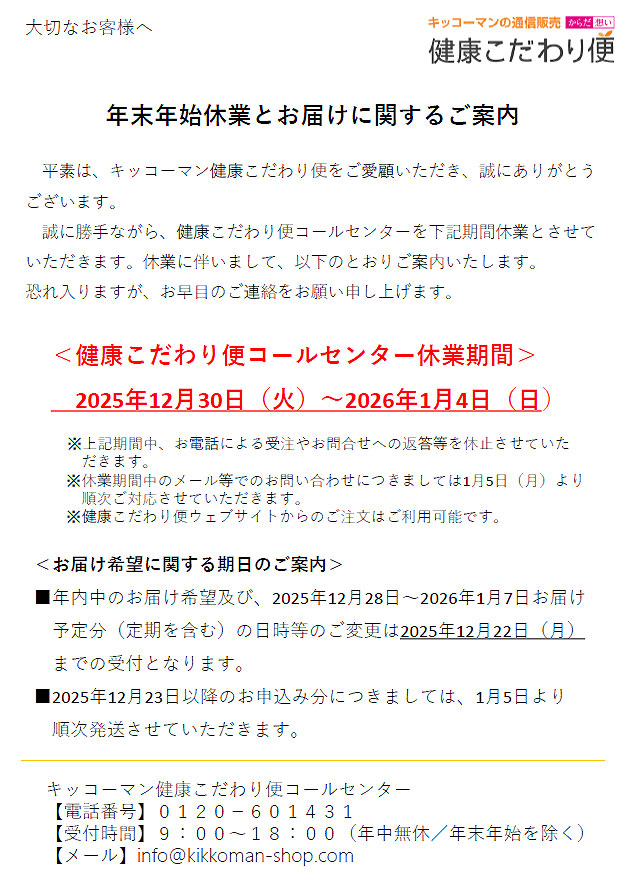 年末年始休業とお届け変更に関するご案内