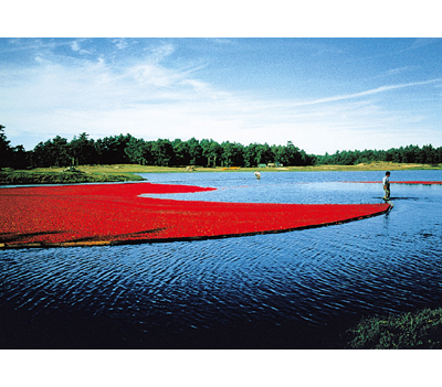 凍った水に覆われたクランベリーは冬の厳しい環境を生きのび、春、溶けた水を抜いたボグに花をつけます。7月中旬には花びらが落ち、その後に残った小さな緑色のふくらみが、夏の太陽をいっぱいに浴び、ルビー色に輝く、完熟したクランベリー果実となっていきます。収穫は9月から10月。ふたたびボグに水を入れ、収穫機でボグをかき回して、果実を蔓から切り離します。クランベリー果実はまん中に小さな空洞を持っているため、水面に浮かび上がります。水に浮かんだ果実は囲まれるように集められ、鮮やかなルビー色をしたクランベリー果実の収穫となります。