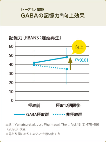 認知機能の低下を自覚する40歳以上の健常者(30名)を対象にGABAを1日100mg12週間連続摂取させた結果、12週間後にGABAを摂取しない群(28名)と比較して記憶力(見たり聞いたりしたことを思い出す力)が有意に向上しました。