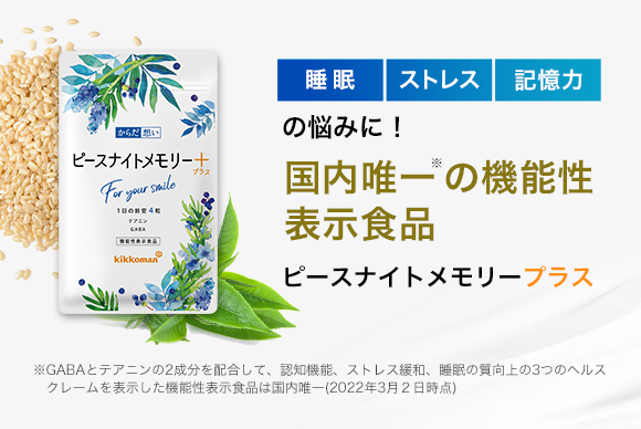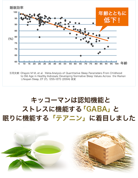 中高年になると、男女を問わず「睡眠」「ストレス」「記憶力」の悩みが増えてきます。キッコーマンは、これら3つの悩みに寄り添う成分として、GABAとテアニンに着目しました。質の高い睡眠や気力の充実、中高齢者の記憶力向上が期待できることがわかっています。