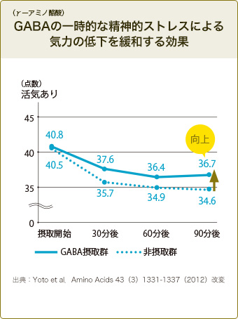 健常な男女63名にGABA100㎎を摂取して頂いた後、計算などのストレス負荷を30分間かけたテストを3回繰り返し、各テスト終了後に主観的指標(活気)について評価したところ、摂取しない群と比較して、GABA摂取群は開始30分、60分、90分後に活気の数値が有意に高値を示していました。